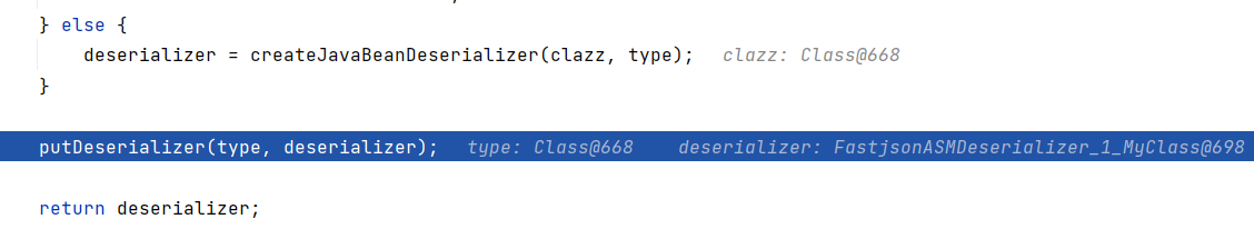调用 ParserConfig#getDeserializer ,于是 ICompilationUnit -> JavaBeanDeserializer 的映射被加入缓存中。