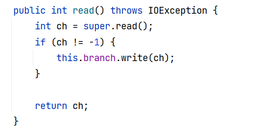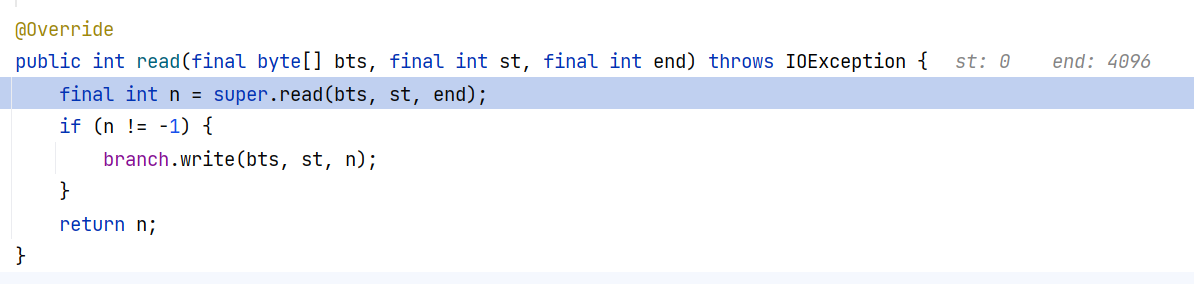 同理将这个 InputStream 换成 TeeInputStream ,调用 TeeInputStream#read 方法,把 InputStream 流里读出来的东西,再写到 OutputStream 流里: