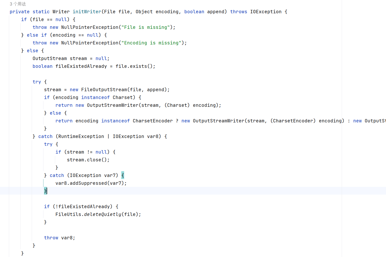 FileWriterWithEncoding#initWriter ,这里有一个细节需要注意:创建文件流的时候调用 new FileOutputStream(file, append) ,append 用来决定文件追加还是覆盖,如果传入 append 为 true 则表示追加模式,不会覆盖原有文件。不过在 fastjson 中这个值我们是能自主控制的: