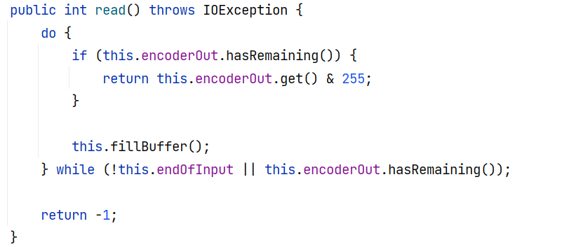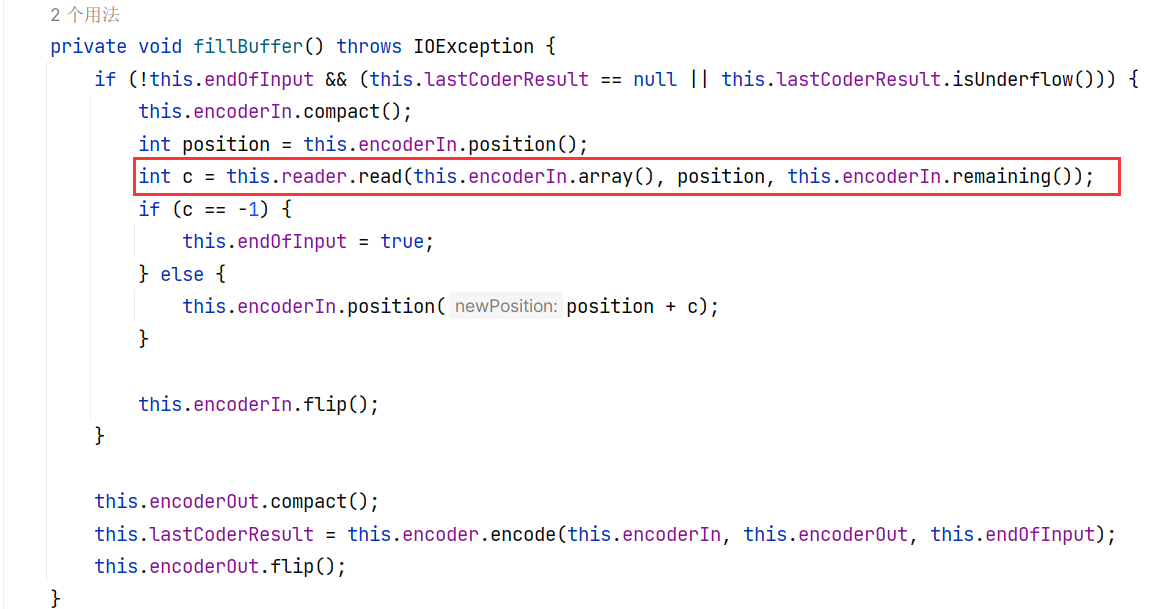 其调用 this.fillBuffer() ,将数据从 this.reader 中读取出来放到 this.encoderIn ,也即一个 CharBuffer 缓冲区:
