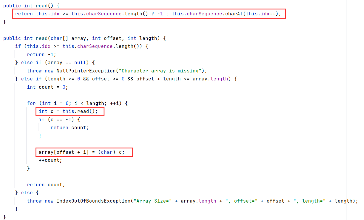 将 this.reader 换成 CharSequenceReader ,CharSequenceReader#read 将 this.charSequence 中的数据读取出来放入传入的 array 中:
