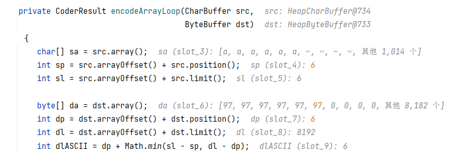 跟进到 encoder.encode ,即 CharsetEncoder#encode ,继续往下会跟到 UTF_8$Encoder#encodeArrayLoop ,它负责将数据从原缓冲区复制到目标缓冲区: