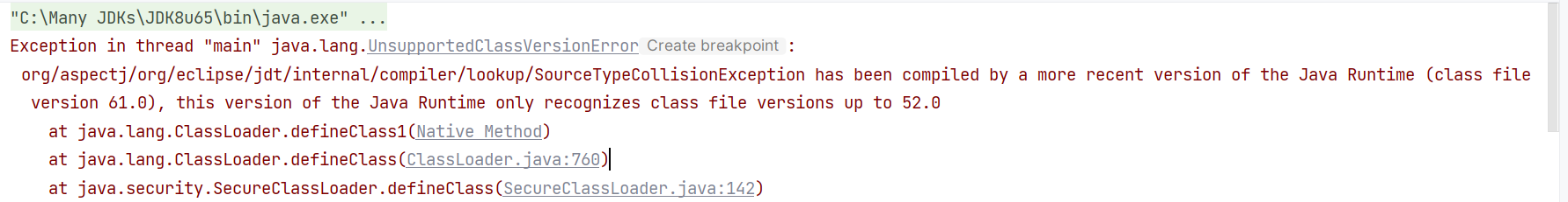 注意:从 AspectJ 1.9.21 开始,官方把编译环境升级到 JDK 17,因此 aspectjtools-1.9.21+ 中所有类都带着 class-file version 61,如果你的运行环境仍停在 JDK 8–11,就会在任何尝试加载这些工具包类的地方抛 UnsupportedClassVersionError: