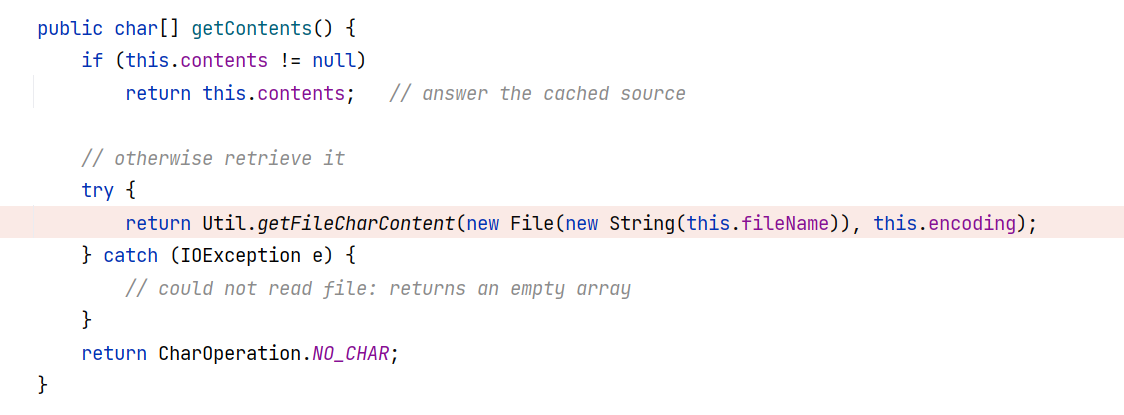 于是 BasicCompilationUnit#getContents 方法被调用,其会读取 this.fileName 所指示的文件内容: