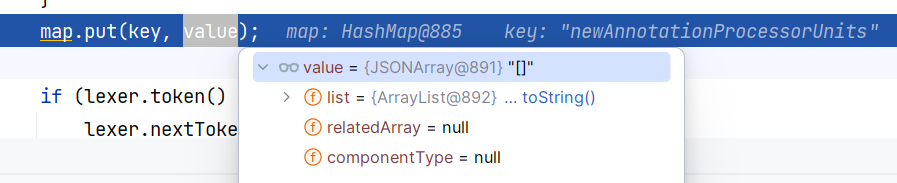 MapDeserializer 接着调用 DefaultJSONParser#parseArray 方法来解析 newAnnotationProcessorUnits 属性。解析完以后,将 "newAnnotationProcessorUnits" -> JSONArray 对象 添加进 map 集合中: