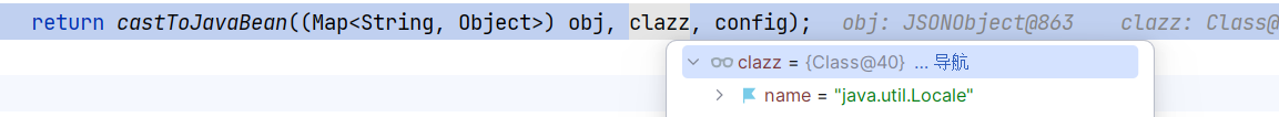 MiscCodec 的最后,调用 JSONObject.toJavaObject 对 com.alibaba.fastjson.JSONObject 对象及下属 map 集合进行类型转换,JSONObject.toJavaObject 后续调用 TypeUtils.castToJavaBean ,不过与开头不同的是,这里指示的当前类是 java.util.Locale 类,要转换的对象为 JSONObject 对象: