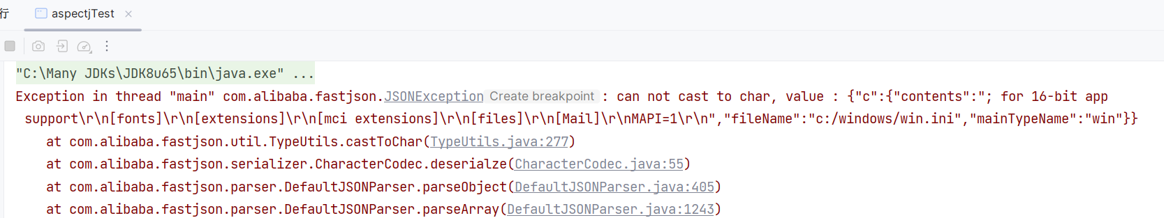fastjson 通过调用 BasicCompilationUnit 的所有 getter 方法,获取到 BasicCompilationUnit 对象各个属性的值,经过 toString 处理成字符串,最后与报错信息一同返回,就是我们看到的这样: